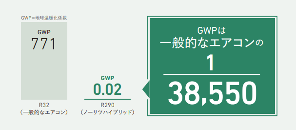 一般的な冷媒「R32」の地球温暖化係数が771に対し、R290はなんと0.02!