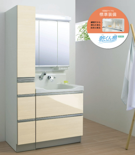引き出しや開き扉のプランがあり、小物からタオルまで効率よく収納できます。ミラー裏には洗面用具の収納もあり、洗面スペースをすっきり保てます。