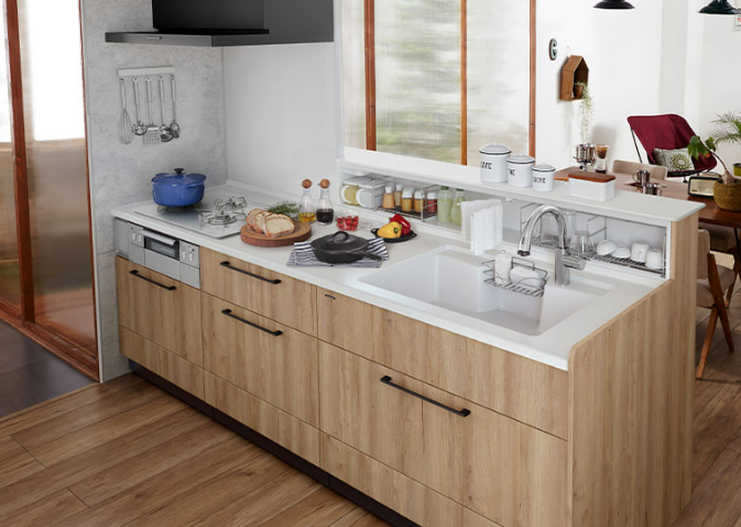 既存のキッチンスペースにジャストサイズで収まるので、余計な造作工事をしなくてもすっきり納まります✨隙間がなければゴミやホコリも溜まりにくく、お掃除の手間も軽減できますね🎵