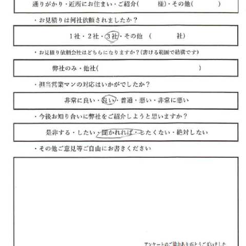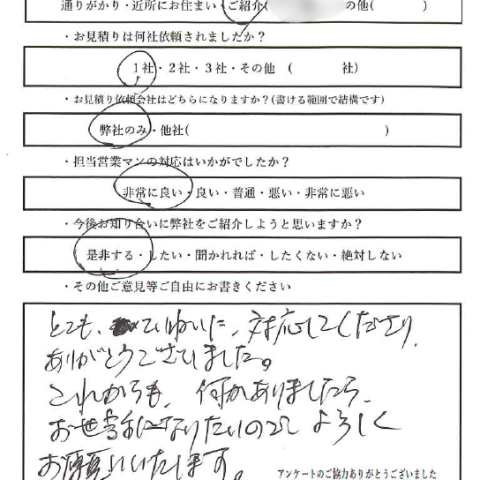一覧 < new back > 大津市 S様 お客様アンケート 信頼できる営業さんで 安心してリフォームできました 工事も非常に丁寧で満足しています またよろしくお願いします アンケートのご協力ありがとうございました 一覧 < new back >